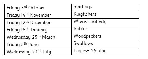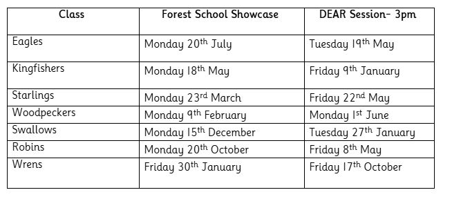 This year we invite parents to join their children in our collective worship performances, take part in end-of-term forest school and join in a DEAR (drop everything and read) session. These dates/times are set out below.