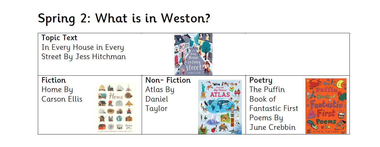 Our learning every half-term is underpinned by high-quality books. These will supplement the children's learning in order to deepen their understanding of topics. These books are purposeful and hand-picked by teachers at Weston.